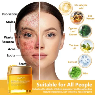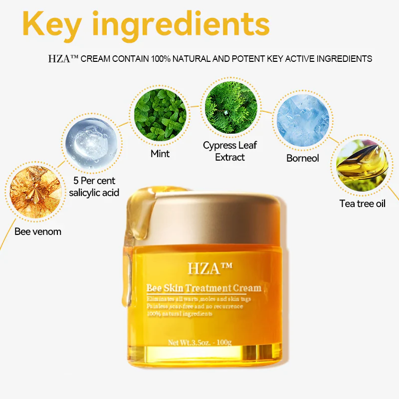 HZA™ የንብ ቆዳ ማከሚያ ክሬም የቆዳ መለያዎችን፣ አይጦችን፣ ኪንታሮቶችን እና እከሎችን ጨምሮ የተለያዩ የቆዳ ጉድለቶችን በብቃት ለመፍታት የንብ ንጥረ ነገሮችን ኃይለኛ ባህሪያትን ይጠቀማል። ከንቦች ውስጥ ንቁ በሆኑ ውህዶች የበለፀገው ይህ የላቀ ቀመር የማይፈለጉ እድገቶችን ለማሟሟት እና በቀስታ ለማስወገድ ይሠራል።
